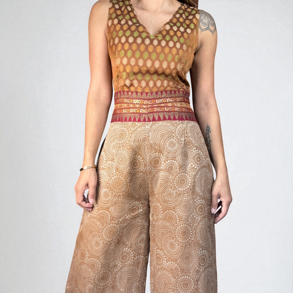 • Unique Piece: Each jumpsuit is one-of-a-kind, reflecting the individuality of the upcycled sari fabric and vibrant border detailing.