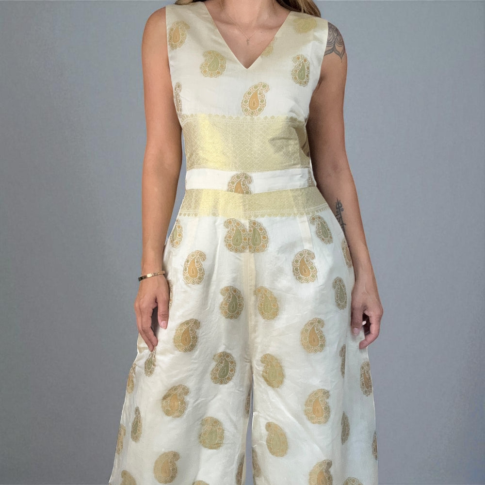 • Unique Piece: Each jumpsuit is one-of-a-kind, reflecting the individuality of the upcycled sari fabric and vibrant border detailing.