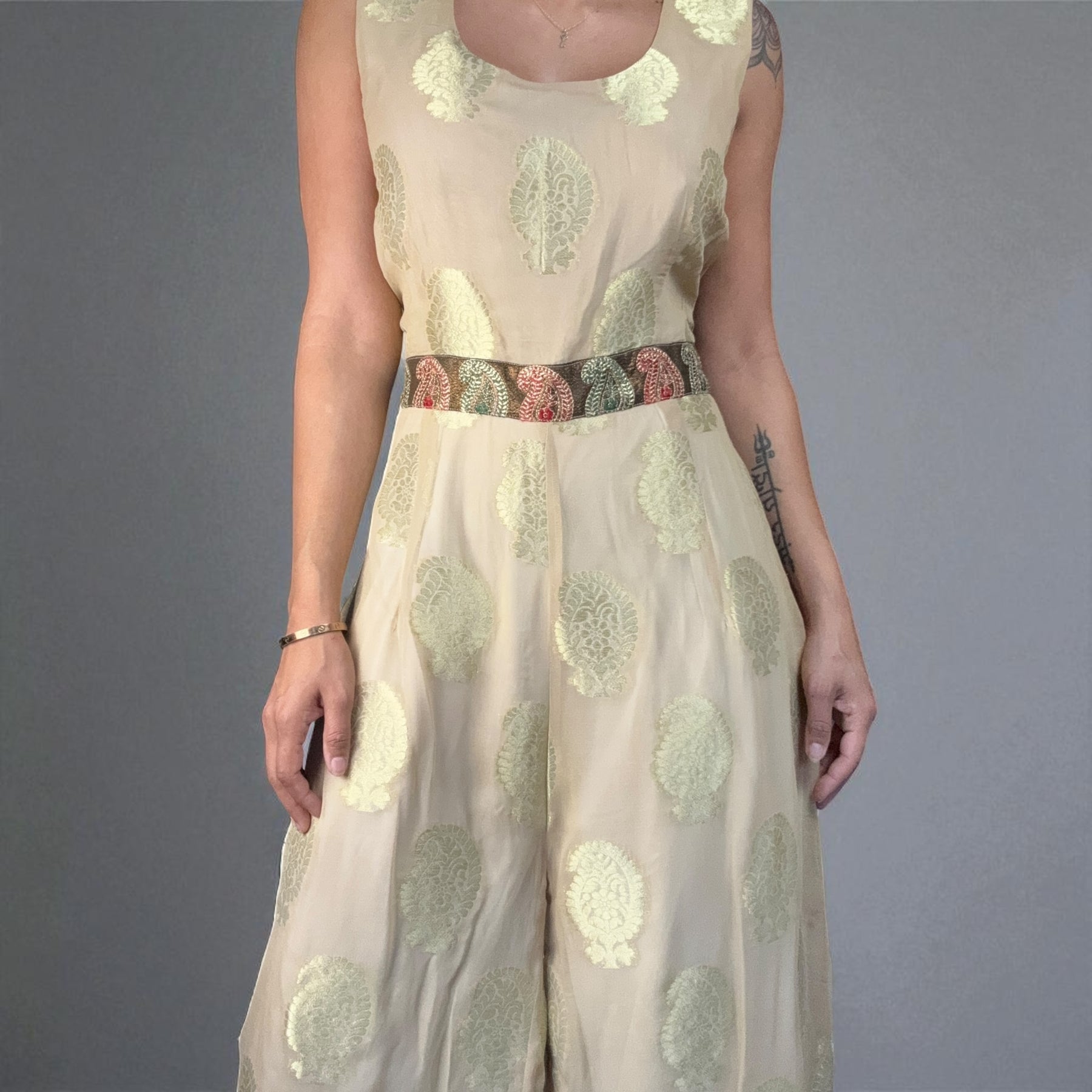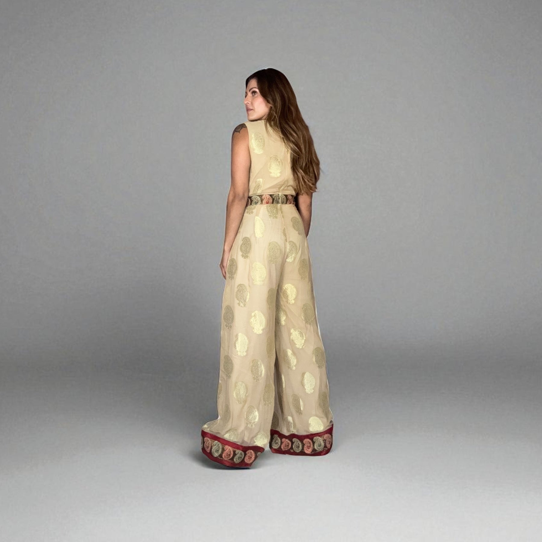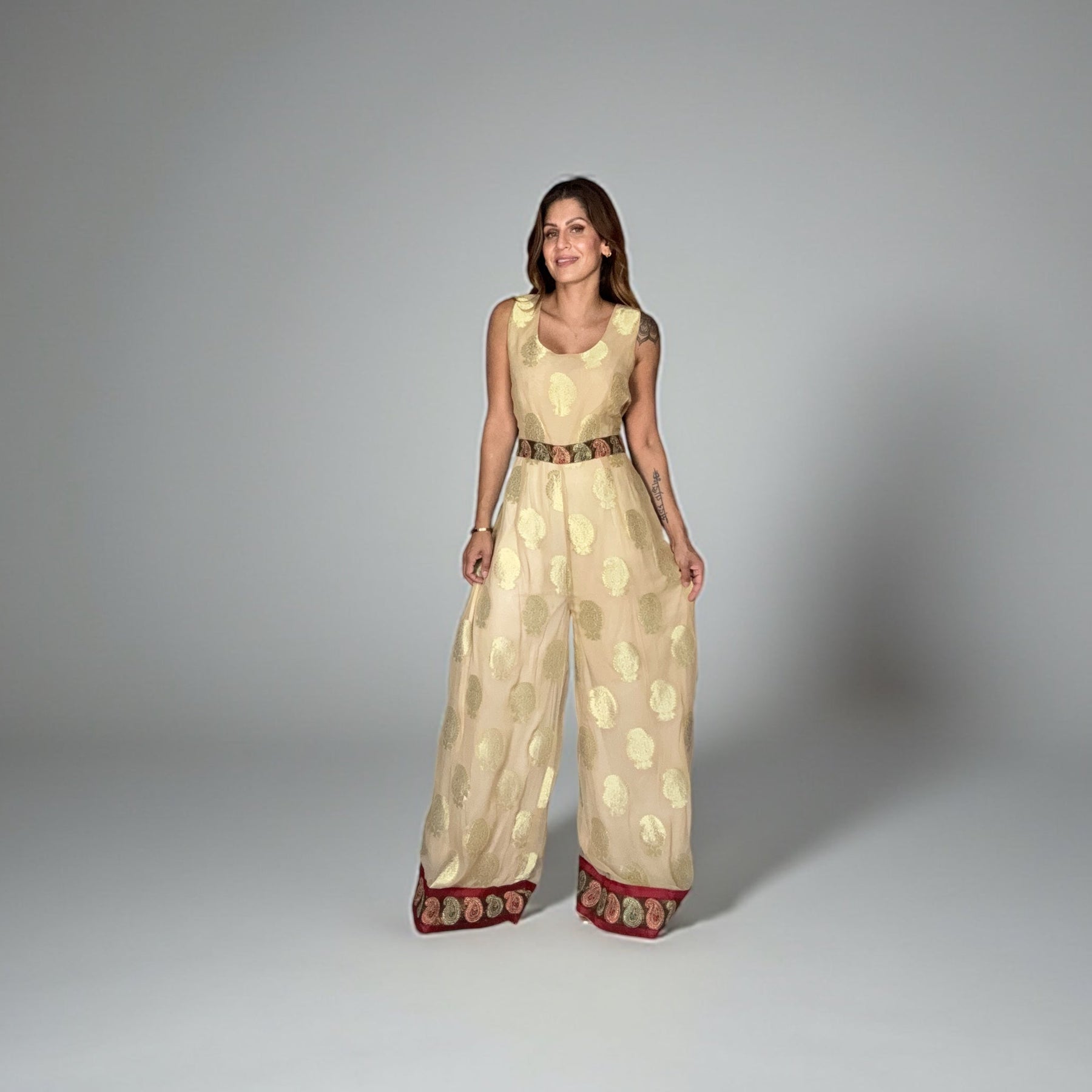 • Unique Piece: Each jumpsuit is one-of-a-kind, reflecting the individuality of the upcycled sari fabric and vibrant border detailing.
