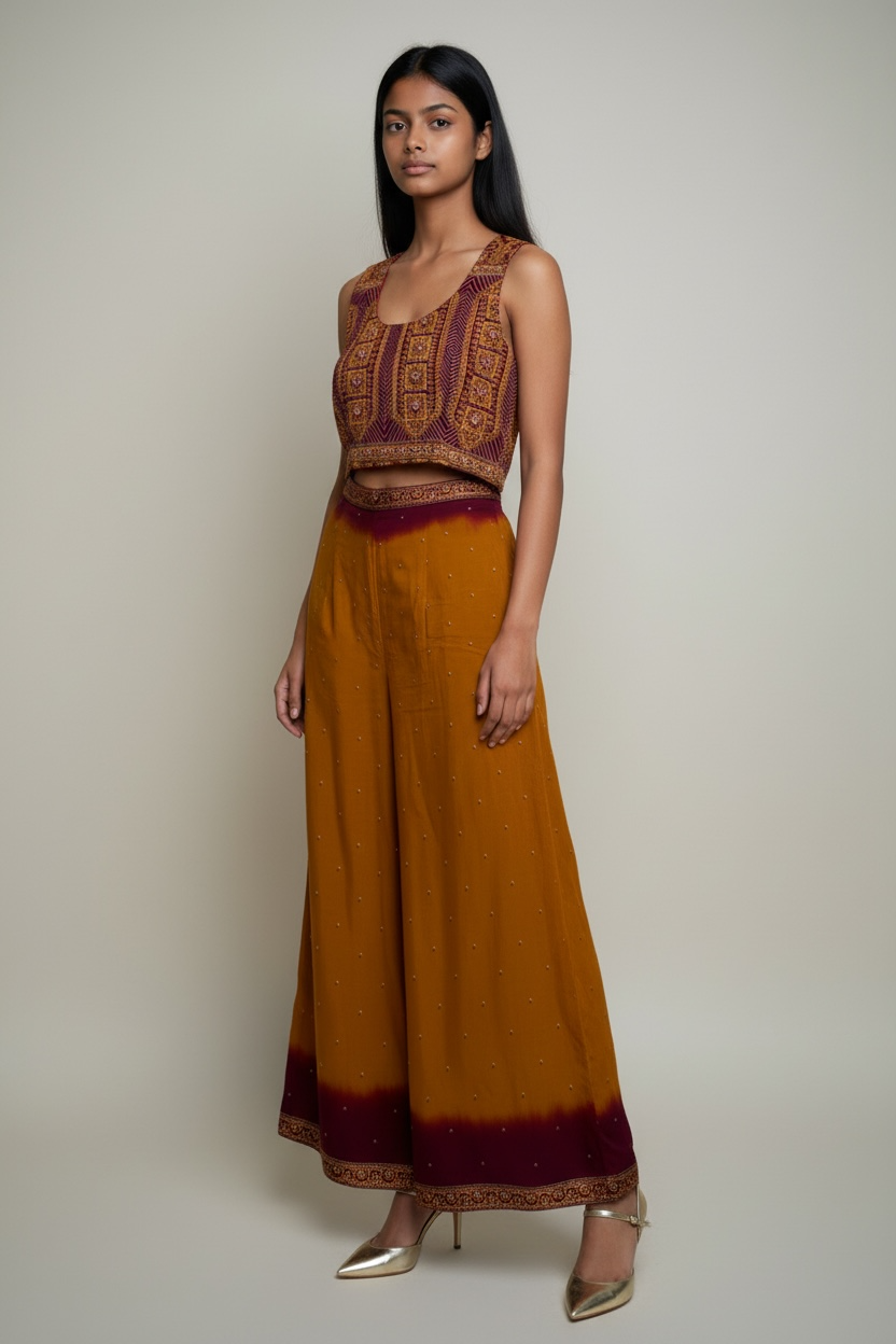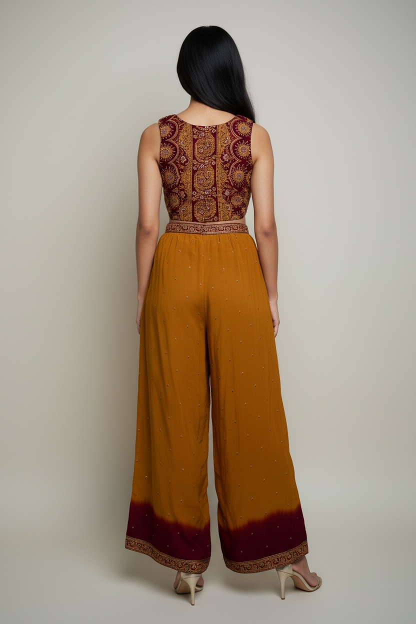 • Upcycled Sari: Made from a printed georgette sari, blending traditional fabrics with a modern silhouette.