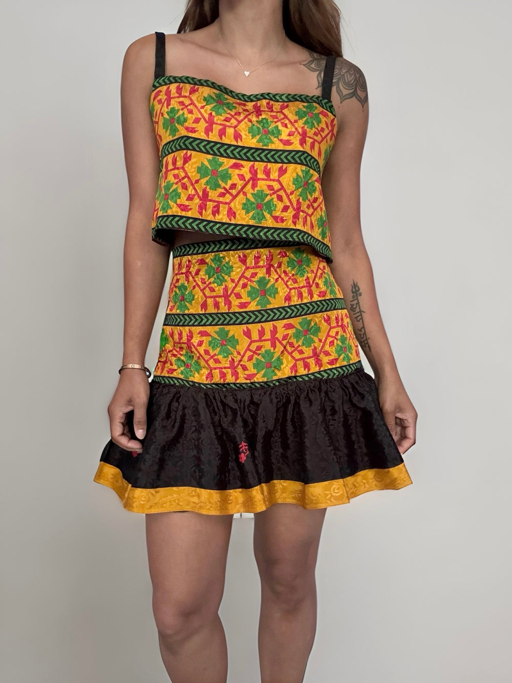 • Upcycled Silk Sari: Made from a printed satin/silk sari, giving new life to traditional materials.